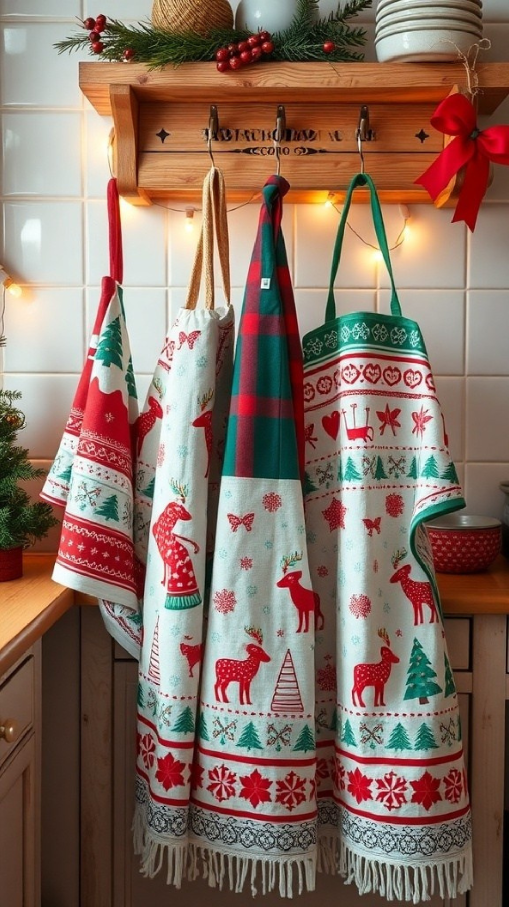 Brighten up your holiday kitchen with cheerful dish towels and aprons. These fun pieces not only add a cozy Christmas vibe but also make great conversation starters during your Christmas gathering. Choose designs that reflect your style, whether it’s farmhouse Christmas or classic holiday kitchen decor.