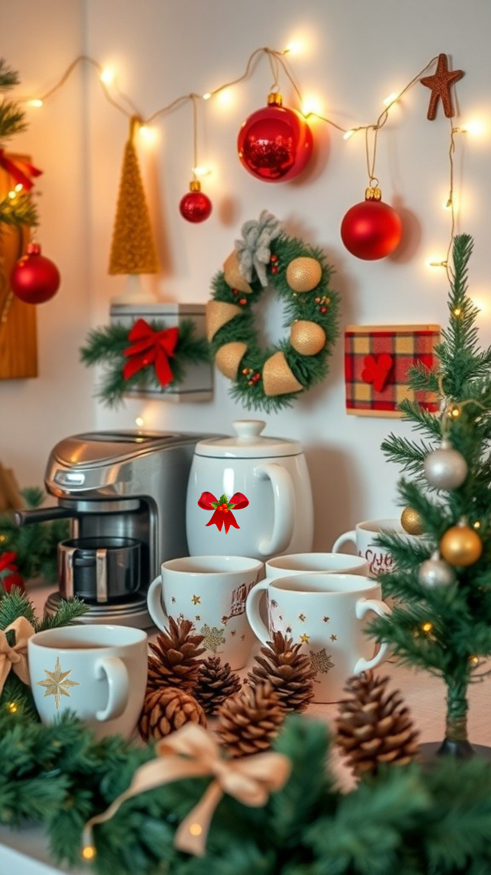 A cozy Christmas coffee station can bring warmth to your holiday kitchen. Add festive mugs and a small tree to create a cheerful vibe for your Christmas gathering. With simple touches like pinecones and ornaments, your kitchen decor will feel inviting and full of holiday spirit.