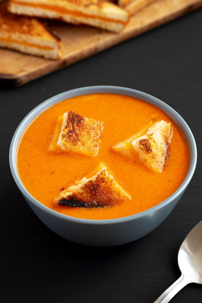 - Prepare a quick grilled cheese, cut into small squares, and pack separately so that you can add to the hot tomato soup.