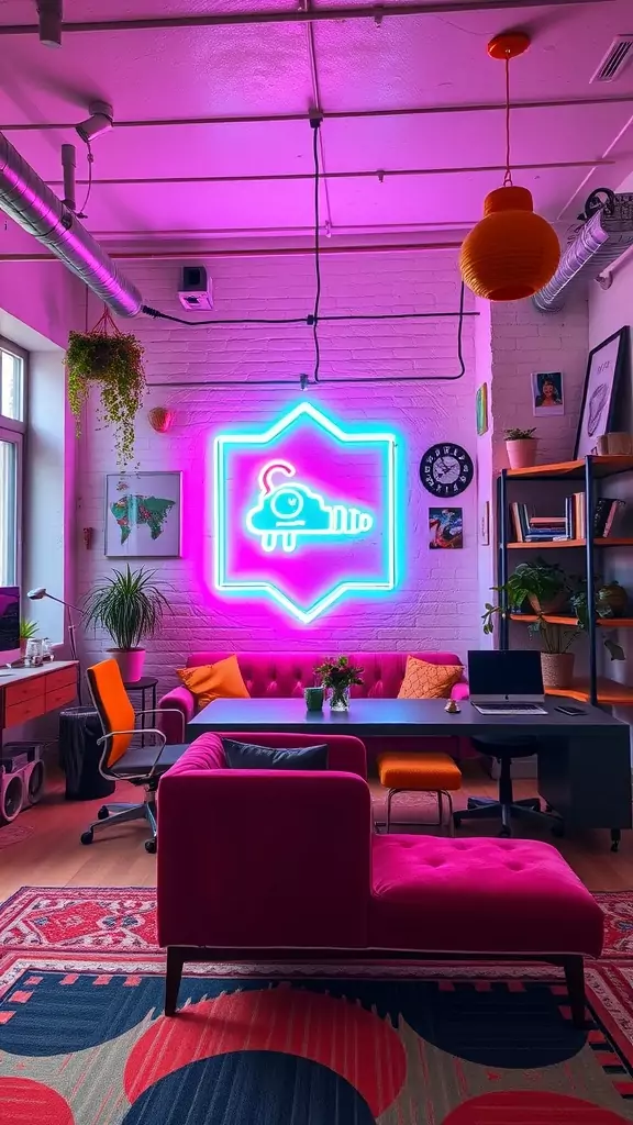 Neon signs can really amp up your eclectic office vibe. They add a fun, quirky element that makes your workspace feel cozy and inviting. Whether you go for a bold phrase or a simple design, it’s a great way to showcase your personality in a maximalist office.