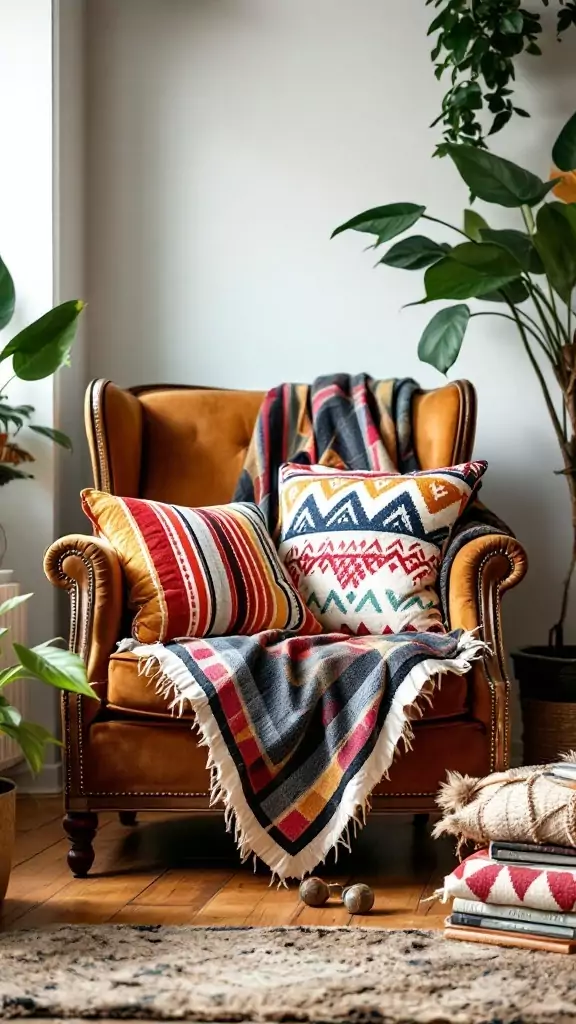 Textiles can really amp up the vibe of your eclectic office. Think cozy throws and colorful pillows on your chair for that perfect maximalist office feel. This simple touch makes your workspace inviting and can even inspire creativity in your Bohemian study room.