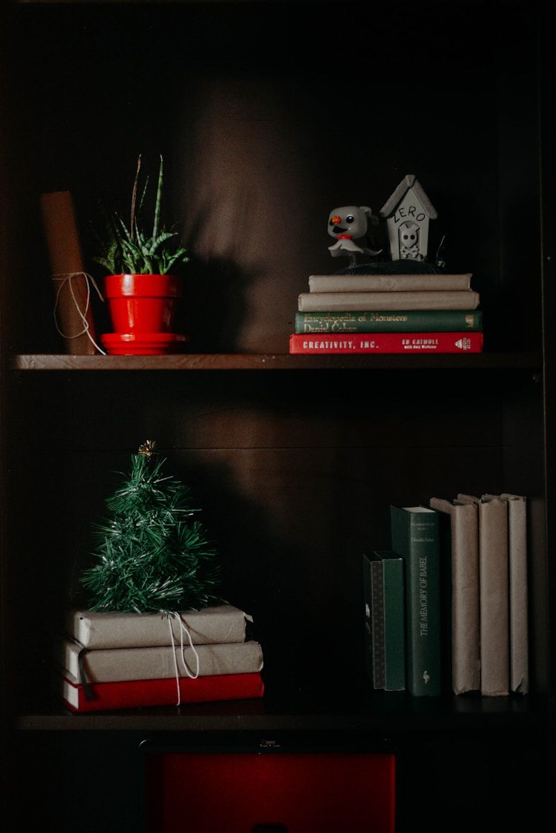 Create a fun Christmas decor office shelf in your office holiday space to spread joy and laughter. Use miniature Christmas trees, tree ornaments, and brightly-colored pottery to create that holiday spirit vibe!