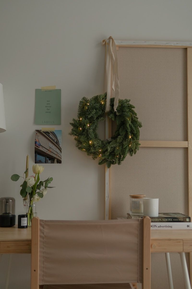 Adding a Christmas wreath to your office walls is a wondrous and festive decor idea to spruce up your workspace. You can even add some twinkling string lights to the Christmas wreath.