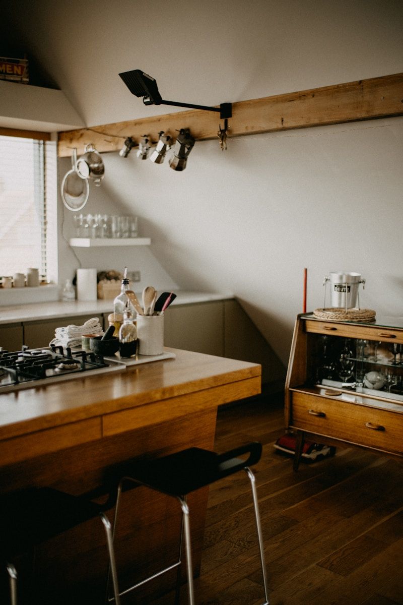 An industrial-style kitchen desk brings a unique retro charm to your cooking space. With its mix of wood and metal, it creates a kitchen area that feels both stylish and cozy.