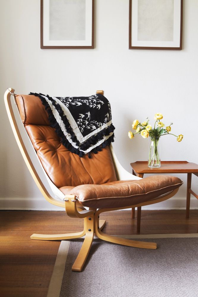 A leather lounge chair in a warm tone can be a great addition to your mid century modern home office. Its sleek design, soft cushions, and cozy vibe make it perfect for both work and relaxation.