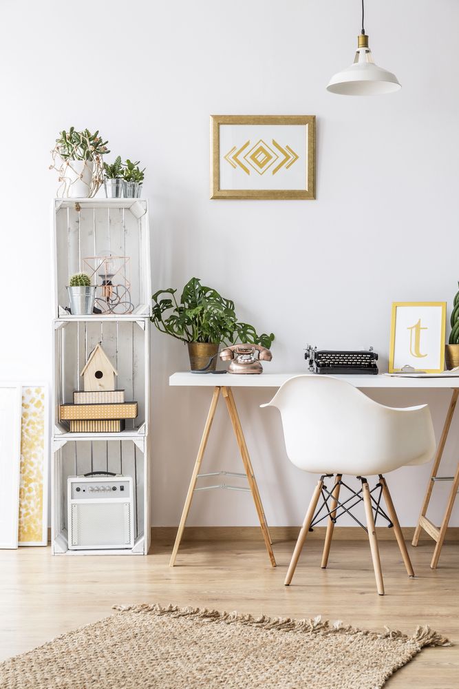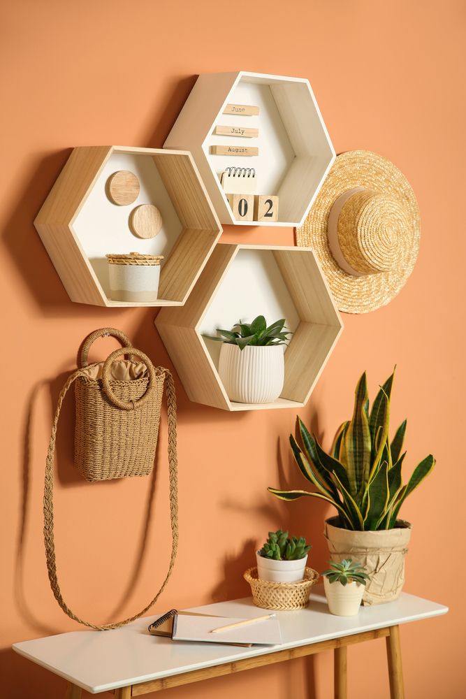 Incorporating geometrical wall shelving into your living room office can maximize vertical space while maintaining a stylish vibe. This setup not only provides a functional space for your desk but also allows for creative display of plants and other mementos.