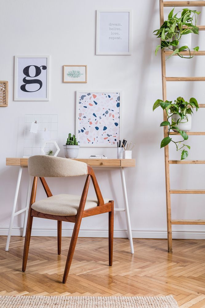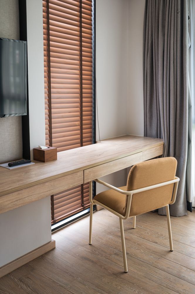 Imagine working at a floating desk right by the window, where natural light brightens up your day. And if the light becomes too much you have modern blinds to block the light. This setup not only creates a stylish office within your living room but also maximizes your functional space.