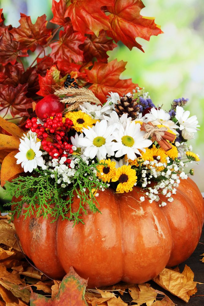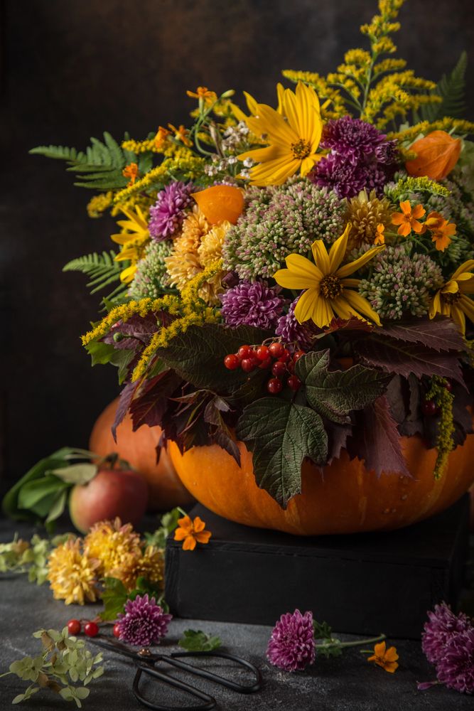 A hollowed-out pumpkin filled with seasonal flowers is a great addition to your Thanksgiving table setup. The combination of vibrant colors of the flowers with the rusticity of the pumpkin creates a warm and inviting centerpiece for your Thanksgiving feast.
