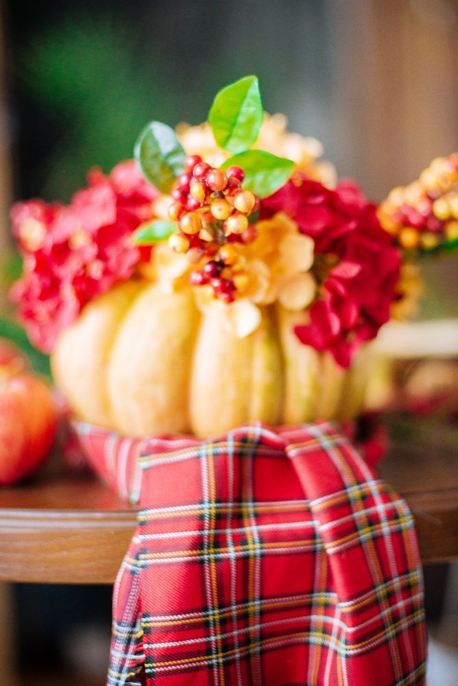 A floral cornucopia utilizing a hollowed out pumpkin as a vase is a stunning way to bring life to your Thanksgiving table settings. Filled with vibrant seasonal blooms and leaves adds a warm glow to your fall table decor.