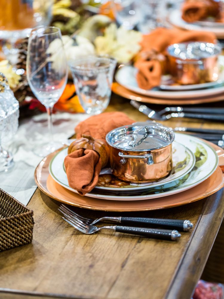 For a chic and cozy Thanksgiving feast, a copper and cream table setup sets a warm tone. Add some gourds, pine cones, and candles for that extra touch of fall table decor!