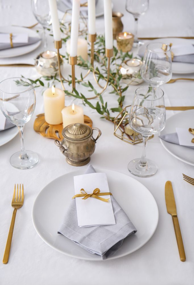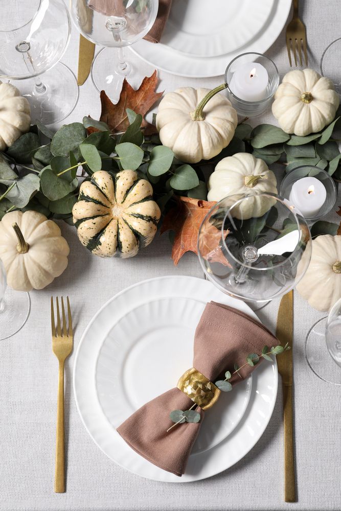 A gold and white theme adds a touch of chic to your Thanksgiving table. Use gold accents like cutlery and exquisite candle holders to create a warm glow, while white dishes keep it clean and fresh.