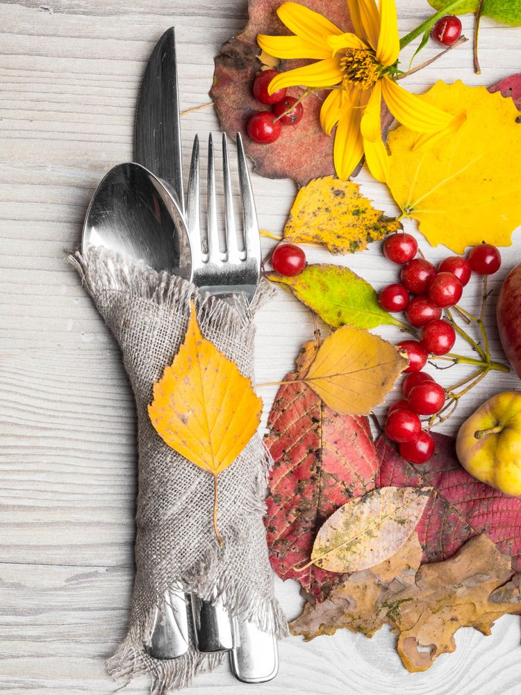 A traditional fall colors table setting creates the right seasonal setting for your Thanksgiving feast. Utlize burlap-wrapped cutlery, colorful fall leaves, and red cranberries to set the seasonal tone.