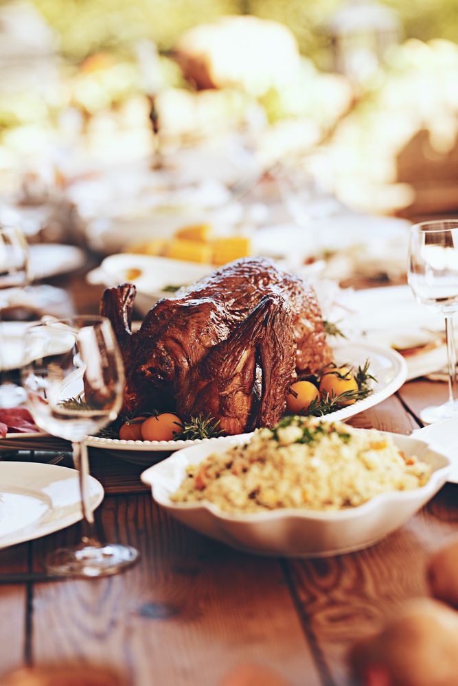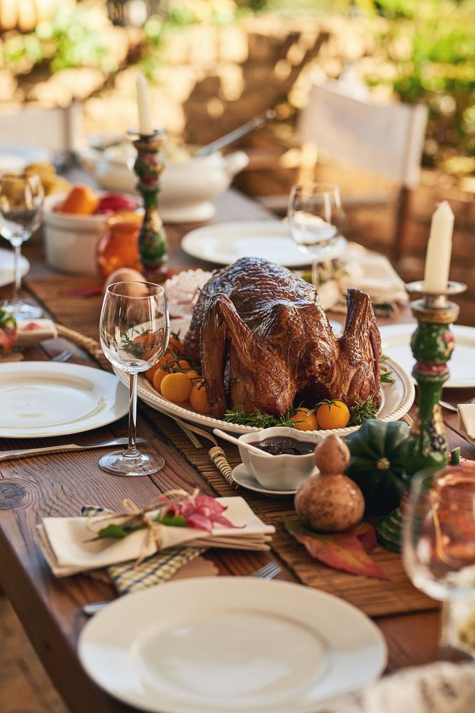 If you live in a temperate climate or happen to get a warm stretch of weather, setting up an outdoor Thanksgiving picnic table can create a cozy and inviting atmosphere for your feast. Utilize a rustic wooden picnic table and adorn it with pumpkins, candles, and colorful autumn leaves.