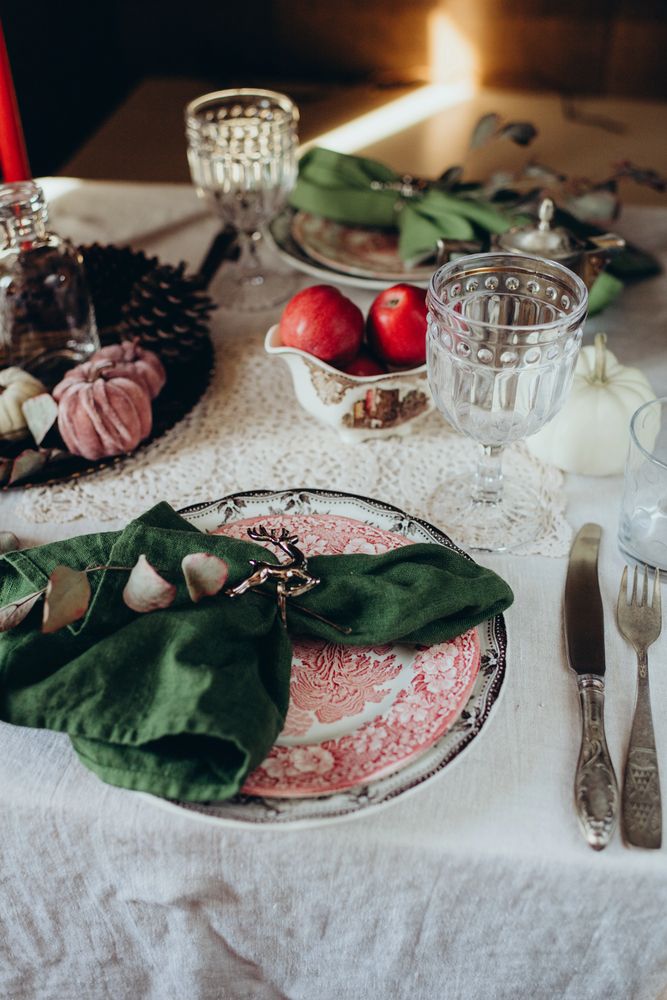 A woodland-themed table decor, as seen above, brings the beauty of nature into your Thanksgiving table. Use elements like corn stalks, burlap, small pumpkins, acorns, and colorful autumn leaves to create that cozy place setting.