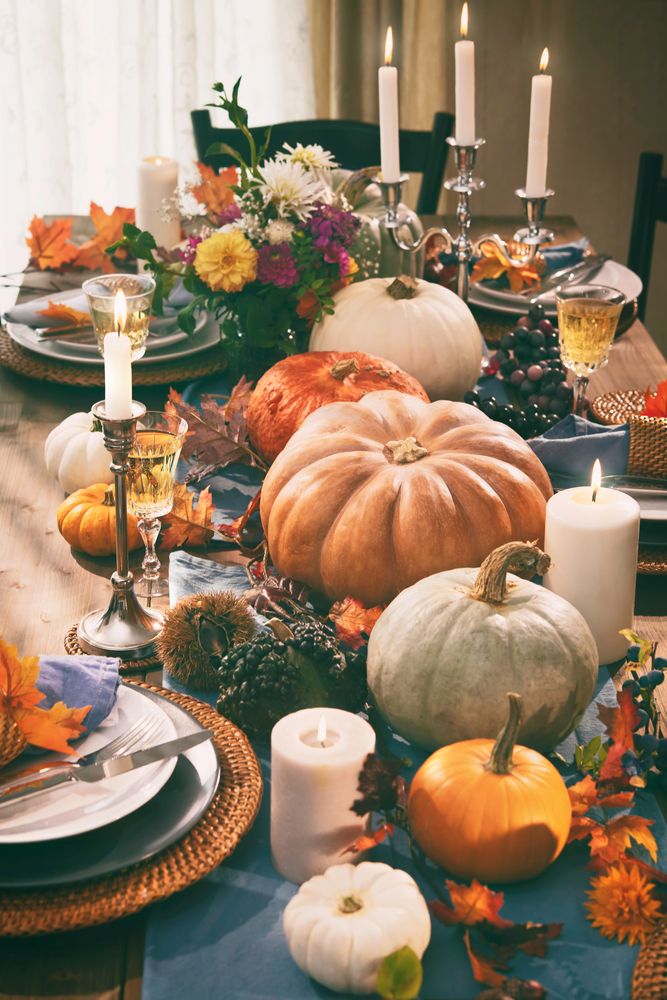 A candlelit harvest table creates the perfect cozy seasonal vibe for your Thanksgiving feast. Pumpkins, colorful autumn leaves, pine cones, and gourds make for an awesome setting for your festive table.