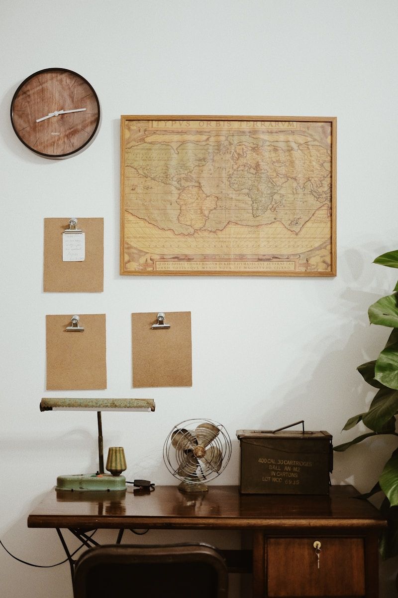 Framed vintage maps can turn your workspace into a charming and retro retreat. They add old-time decor and elicit conversations, making them perfect for a rustic home office or alongside a vintage writing desk.